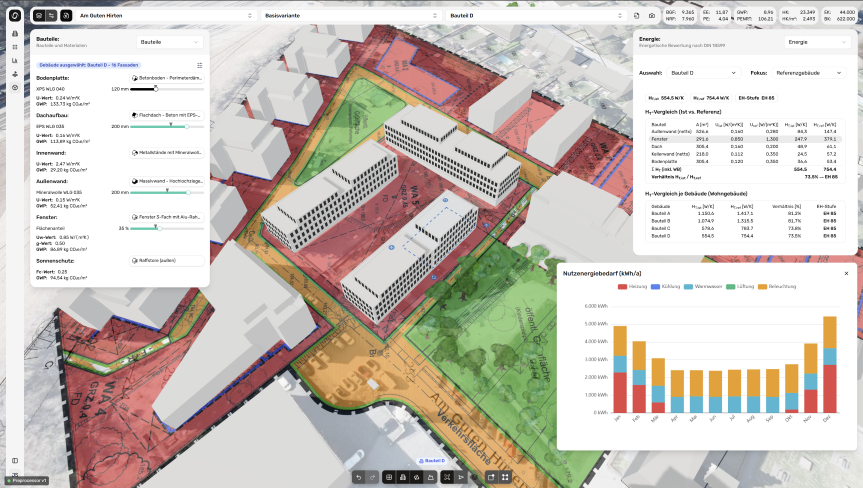 Einbindung standortbezogener Bohrpunktdaten sowie Analysen wie Sonnenstandsberechnungen und dem sommerlichen Wärmeschutz zur besseren Bewertung von Entwurfsvarianten.